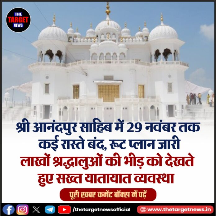 (Road Closures and Route Diversions in Anandpur Sahib Till November 29) श्री गुरु तेग बहादुर जी के 350वें शहीदी दिवस के मौके पर 19 से 29 नवंबर तक श्री आनंदपुर साहिब में विशेष समारोह आयोजित किए जा रहे हैं। रूपनगर के सीनियर पुलिस कप्तान (IPS) गुलनीत सिंह खुराणा ने बताया कि इस ऐतिहासिक आयोजन में देश-विदेश से लाखों श्रद्धालुओं के पहुंचने की उम्मीद है। भीड़ को नियंत्रित रखने, कानून-व्यवस्था बनाए रखने और श्रद्धालुओं की सुविधा के लिए जिला पुलिस ने व्यापक प्रबंध किए हैं।