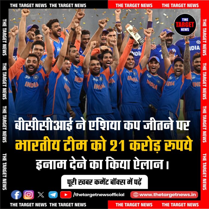 बीसीसीआई ने एशिया कप जीतने पर भारतीय टीम को 21 करोड़ रुपये इनाम देने का किया ऐलान।