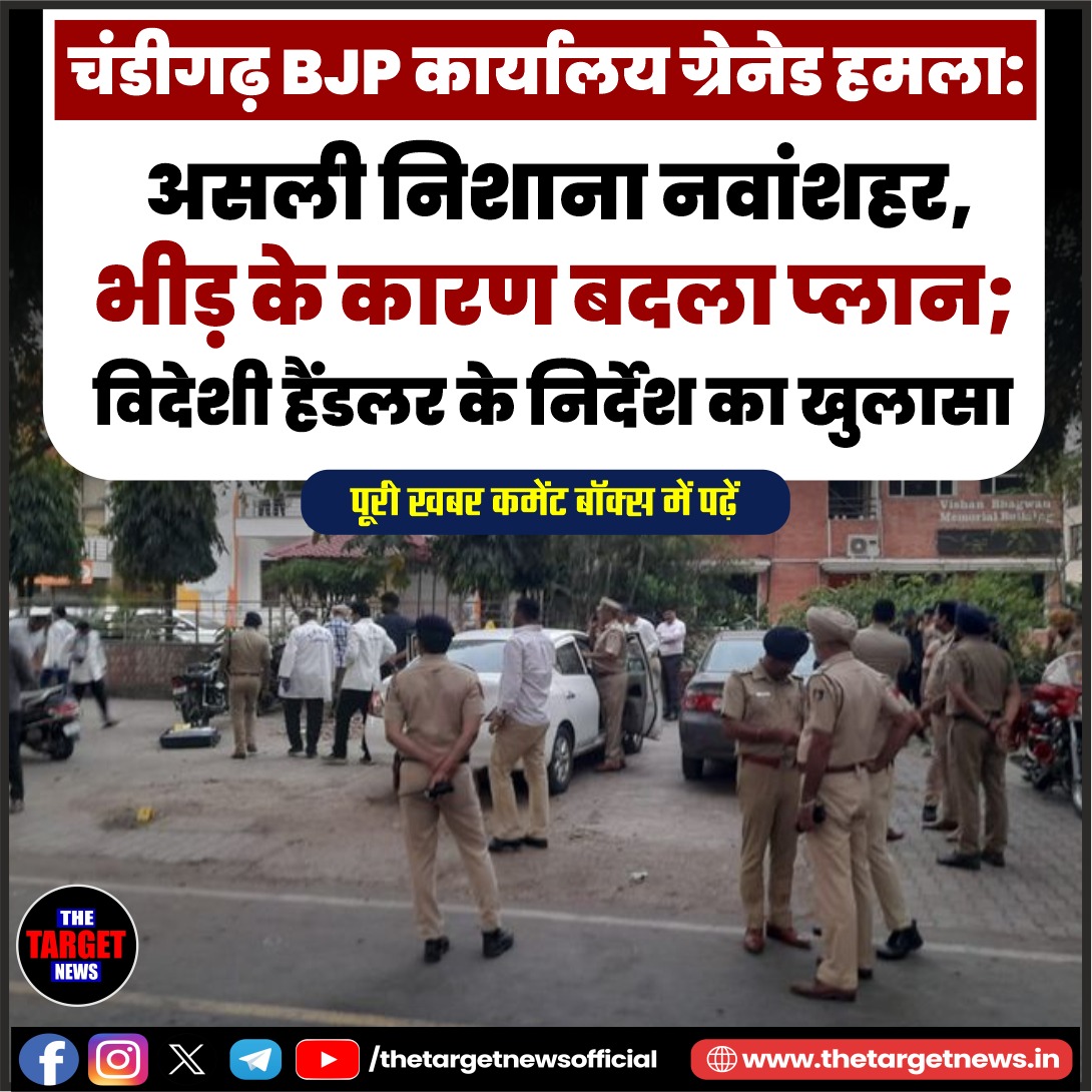 (Chandigarh BJP office grenade attack: The real target was Nawanshahr, but the plan was changed due to heavy crowd; instructions from a foreign handler have been revealed.)चंडीगढ़ में BJP कार्यालय पर हुए ग्रेनेड हमले के मामले में बड़ा खुलासा हुआ है। पुलिस रिमांड के दौरान आरोपियों ने बताया कि उनकी शुरुआती योजना नवांशहर में हमला करने की थी, लेकिन वहां अधिक भीड़ होने के कारण उन्होंने आखिरी समय में प्लान बदल दिया।