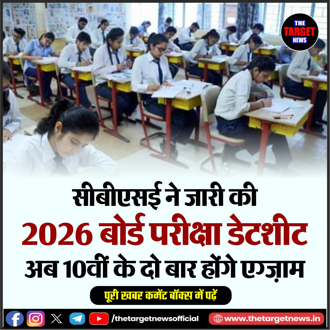 (CBSE releases 2026 board exam datesheet — Class 10 exams to be held twice a year)केंद्रीय माध्यमिक शिक्षा बोर्ड (CBSE) ने 2026 की 10वीं और 12वीं बोर्ड परीक्षाओं को लेकर बड़ा ऐलान किया है। बोर्ड के अनुसार, परीक्षाएं 17 फरवरी 2026 से शुरू होंगी। सबसे अहम बदलाव यह है कि 2026 से कक्षा 10वीं के छात्रों को साल में दो बार बोर्ड परीक्षा देने का अवसर मिलेगा। यह कदम राष्ट्रीय शिक्षा नीति (NEP-2020) की सिफारिशों के तहत उठाया गया है, ताकि छात्रों पर परीक्षा का दबाव कम हो और उन्हें बेहतर प्रदर्शन का मौका मिल सके।