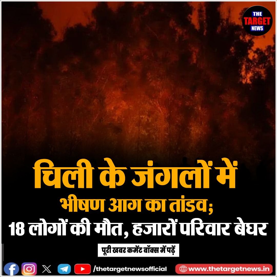 (Deadly Wildfires Ravage Chile)दक्षिण अमेरिकी देश चिली इन दिनों भीषण प्राकृतिक आपदा की चपेट में है। मध्य और दक्षिणी चिली के जंगलों में लगी विनाशकारी आग ने अब तक भारी तबाही मचाई है। इस भीषण अग्निकांड में कम से कम 18 लोगों की जान जा चुकी है, जबकि हजारों परिवार अपने घरों से बेघर होने को मजबूर हो गए हैं। हजारों एकड़ में फैले जंगल जलकर खाक हो चुके हैं और सैकड़ों रिहायशी इलाके आग की चपेट में आ गए हैं, जिससे पूरे क्षेत्र में दहशत और अफरा-तफरी का माहौल है।