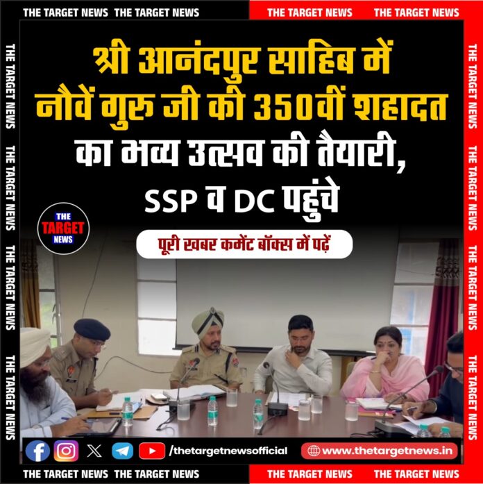 (Preparations Begin for Guru Tegh Bahadur Ji’s 350th Martyrdom Anniversary)श्री आनंदपुर साहिब में नौवें गुरु, श्री गुरु तेग बहादुर जी के 350वें शहीदी पर्व (23 से 25 नवंबर 2025) को लेकर प्रशासनिक तैयारियाँ जोरों पर हैं। डिप्टी कमिश्नर वरजीत वालिया और वरिष्ठ पुलिस अधीक्षक गुलनीत खुराना ने अधिकारियों संग विशेष बैठक कर व्यवस्थाओं की समीक्षा की। उन्होंने कहा कि श्रद्धालुओं की सुविधा सर्वोच्च प्राथमिकता होगी और सभी अधिकारी सेवा भावना से अपने कर्तव्यों का पालन करें।