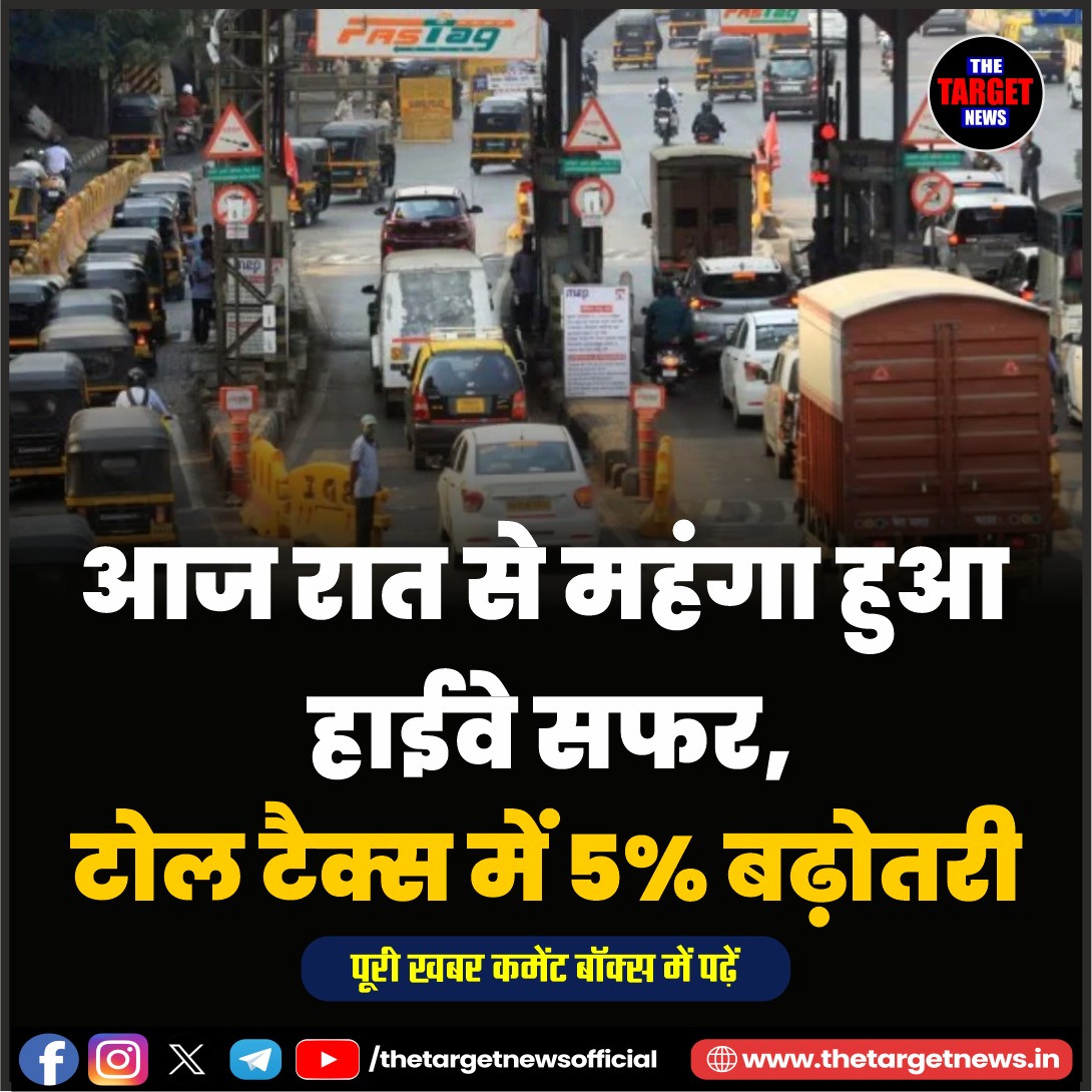 (Highway travel becomes costlier from tonight, toll tax increased by 5%) नए वित्तीय वर्ष 2026-27 की शुरुआत के साथ ही आम जनता को महंगाई का एक और झटका लगने जा रहा है। नेशनल हाईवे अथॉरिटी ऑफ इंडिया (National Highways Authority of India) ने देशभर के राष्ट्रीय राजमार्गों और एक्सप्रेसवे पर टोल टैक्स दरों में औसतन 5 प्रतिशत की बढ़ोतरी को मंजूरी दे दी है। यह नई दरें आज रात 12 बजे से लागू होंगी, जिससे लाखों यात्रियों की जेब पर सीधा असर पड़ेगा।