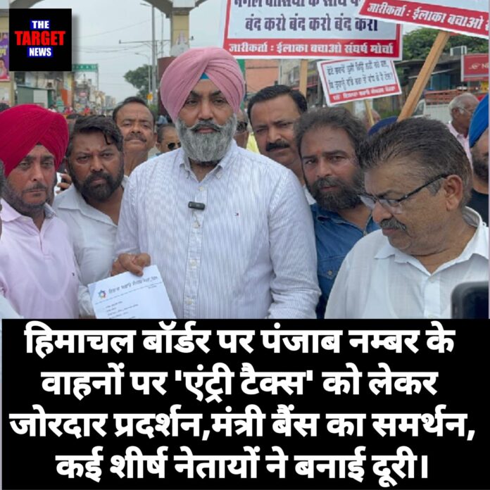 हिमाचल बॉर्डर पर पंजाब नम्बर के वाहनों पर ‘एंट्री टैक्स’ को लेकर जोरदार प्रदर्शन,मंत्री बैंस का समर्थन, कई शीर्ष नेतायों ने बनाई दूरी।