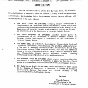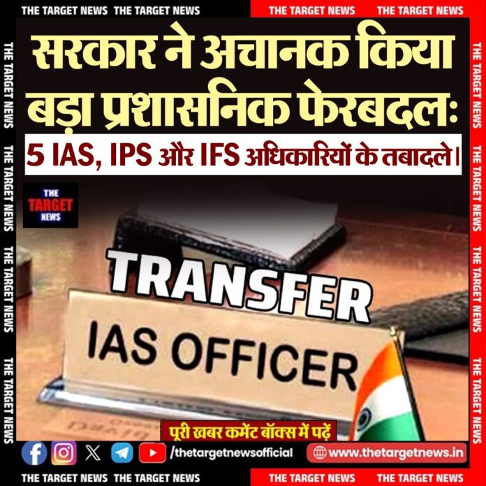 (Himachal Govt Transfers 5 IAS, IPS & IFS Officers in Major Reshuffle)हिमाचल प्रदेश सरकार ने सोमवार को बड़ा प्रशासनिक reshuffle करते हुए 5 वरिष्ठ IAS, IPS और IFS अधिकारियों के तबादला आदेश जारी किए। खास बात यह रही कि यह आदेश मुख्य सचिव प्रबोध सक्सेना ने अपने रिटायरमेंट से कुछ घंटे पहले जारी किए। इसे उनके सेवाकाल का अंतिम आदेश माना जा रहा है, जिसने प्रशासनिक हलकों में नई चर्चा को जन्म दे दिया है।