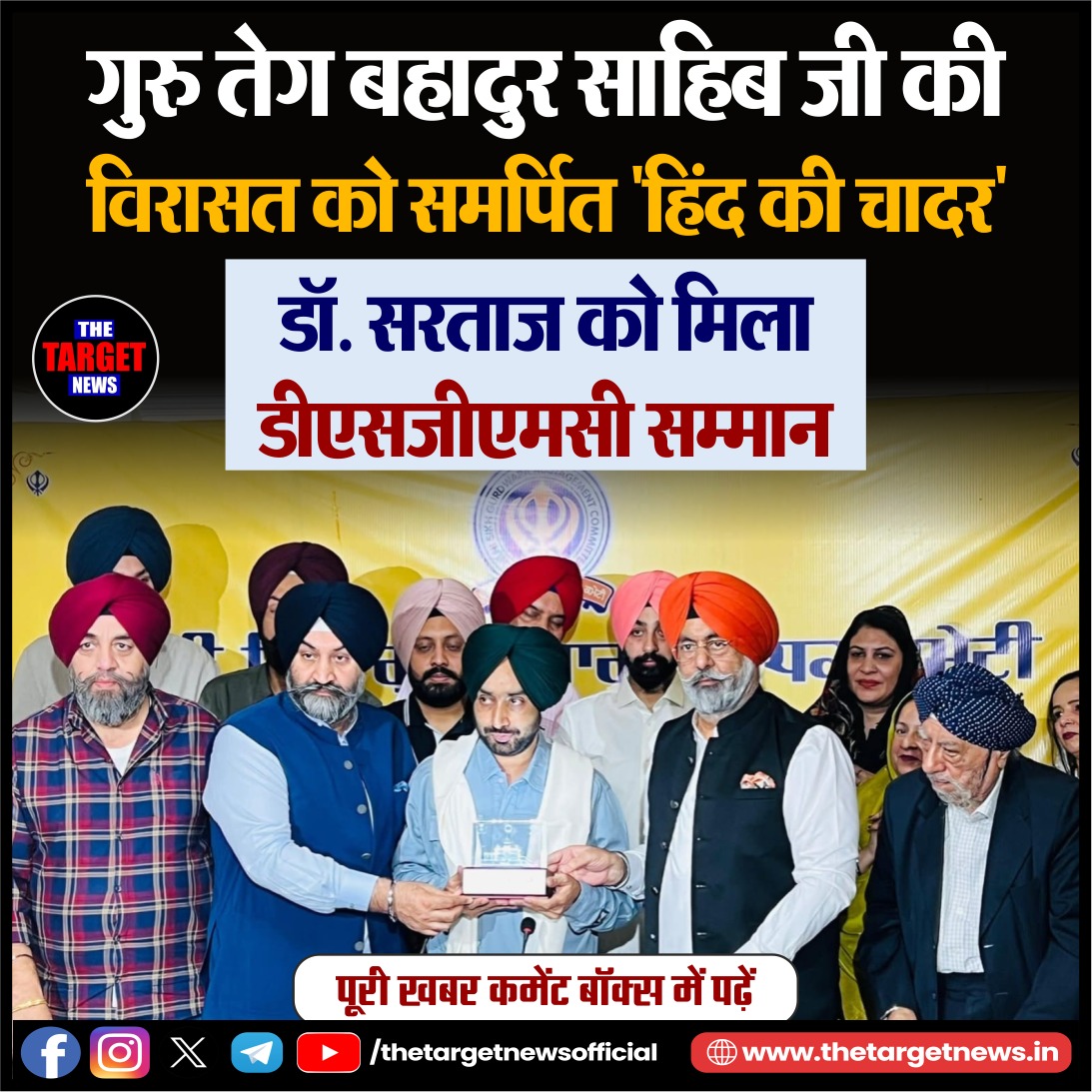 (Hind Ki Chadar’ Award — Dr. Sartaj Honoured by DSGMC for Preserving Guru Tegh Bahadur Ji’s Legacy)श्री गुरु तेग बहादुर साहिब जी के 350वें शहीदी दिवस के उपलक्ष्य में दिल्ली सिख गुरुद्वारा प्रबंधक कमेटी (डी.एस.जी.एम.सी.) ने विश्व-प्रसिद्ध सूफी गायक, संगीतकार और कवि डॉ. सतिंदर सरताज को सम्मानित किया है। यह सम्मान उनकी रूहानी और भावनात्मक रचना “हिंद की चादर” के लिए दिया गया, जो गुरु साहिब जी के सर्वोच्च बलिदान और मानवता के प्रति उनके अमर संदेश को समर्पित है।