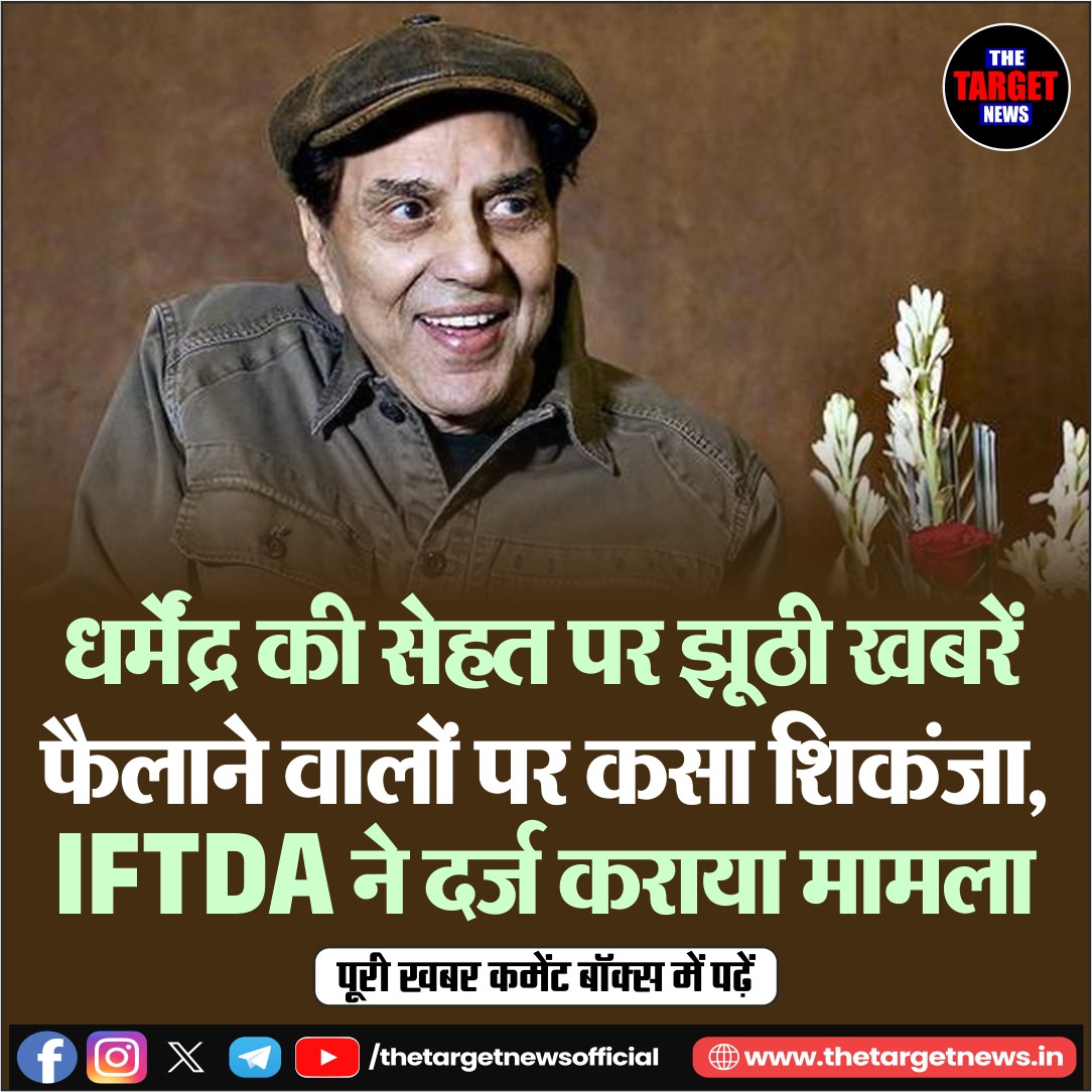 (IFTDA Files Complaint Over Fake News on Dharmendra’s Health)बॉलीवुड के दिग्गज अभिनेता धर्मेंद्र की सेहत को लेकर फैली झूठी और भ्रामक खबरों पर अब सख्त कार्रवाई शुरू हो गई है। उनकी निजता (प्राइवेसी) का उल्लंघन करने और बिना अनुमति निजी वीडियो रिकॉर्ड कर इंटरनेट पर पोस्ट करने के आरोप में फिल्म इंडस्ट्री की प्रमुख संस्था IFTDA (इंडियन फिल्म एंड टेलीविजन डायरेक्टर्स एसोसिएशन) ने पापराज़ी और कुछ ऑनलाइन प्लेटफॉर्म्स के खिलाफ औपचारिक पुलिस शिकायत दर्ज कराई है।