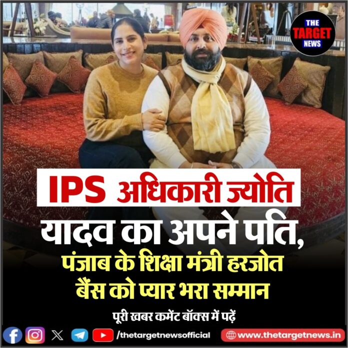 (IPS Officer Jyoti Yadav’s Heartfelt wish to her Husband, Punjab Education Minister Harjot Bains)आईपीएस अधिकारी डॉ.ज्योति यादव बैंस ने अपने पति और पंजाब के शिक्षा मंत्री हरजोत सिंह बैंस के लिए सोशल मीडिया प्लेटफॉर्म X पर एक भावनात्मक जन्मदिन संदेश साझा किया। यह पोस्ट तेजी से वायरल हो गई, जिसे 900 से ज्यादा लाइक्स और हजारों व्यूज़ मिले। ऑनलाइन लोगों ने इस पोस्ट को खूब सराहा, जिसने दोनों के गहरे रिश्ते और मजबूत बंधन को उजागर किया।
