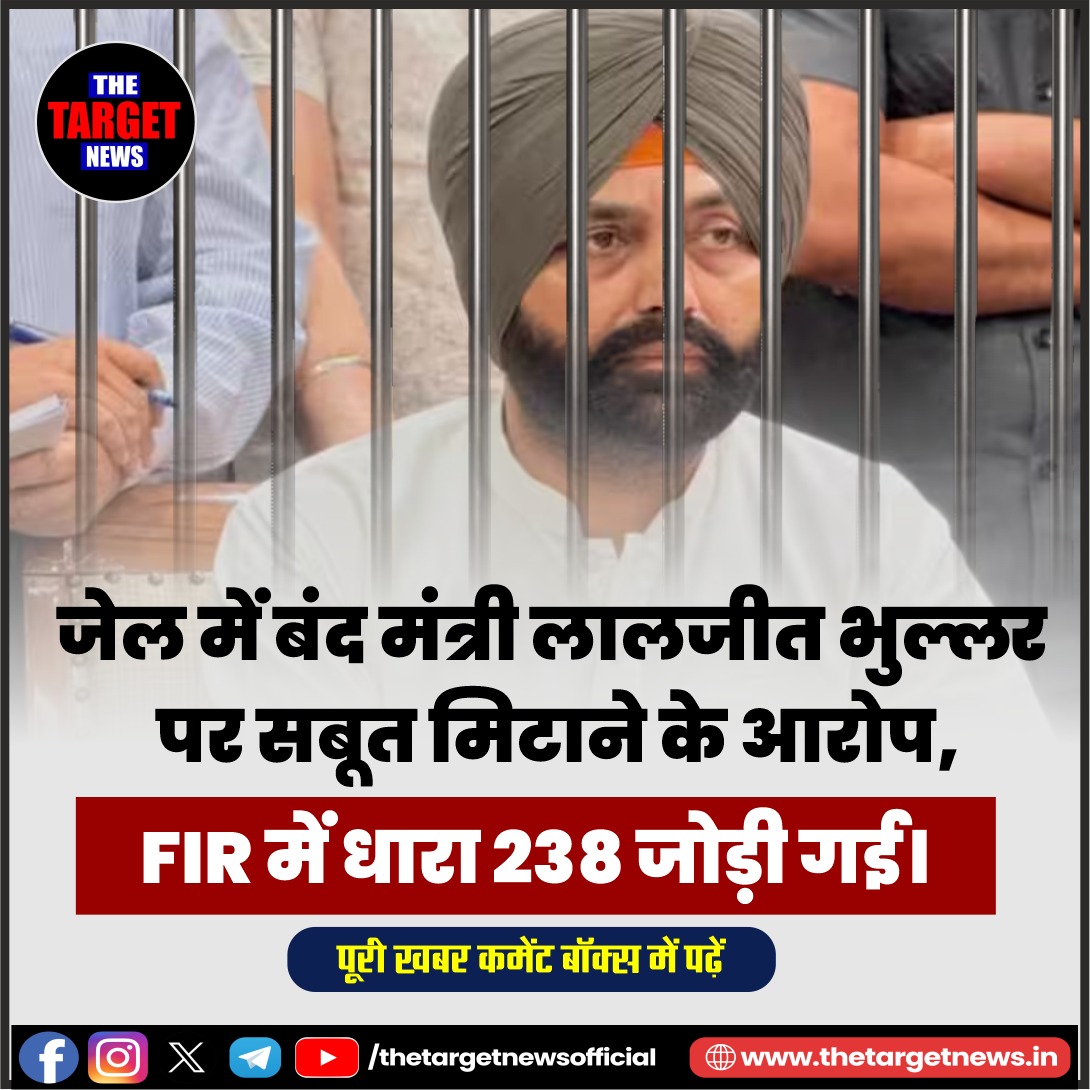 (Minister Laljit Bhullar, who is lodged in jail, has been accused of destroying evidence; Section 238 has been added to the FIR) अमृतसर से DM गगनदीप सिंह रंधावा की मौत के मामले में एक बड़ी अपडेट सामने आई है। इस मामले में जेल में बंद मंत्री लालजीत सिंह भुल्लर के खिलाफ अब एक नई धारा जोड़ दी गई है। उन पर सबूत मिटाने के गंभीर आरोप लगे हैं। इससे पहले उनके खिलाफ आत्महत्या के लिए उकसाने का मामला पहले से ही दर्ज है।