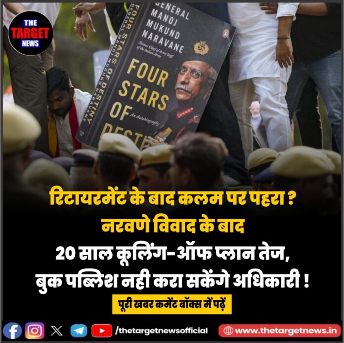 (20-Year Cooling-Off Rule Likely as Naravane Memoir Sparks Row)पूर्व सेना प्रमुख जनरल मनोज मुकुंद नरवणे की अप्रकाशित आत्मकथा को लेकर उठे विवाद के बीच केंद्र सरकार वरिष्ठ पदों पर रहे अधिकारियों के लिए सख्त नियम लागू करने पर विचार कर रही है। प्रस्ताव के मुताबिक रिटायरमेंट के बाद ऐसे अफसरों पर 20 साल का “कूलिंग-ऑफ पीरियड” लागू किया जा सकता है, जिसके दौरान वे अपनी सेवा से जुड़ी किताब प्रकाशित नहीं कर सकेंगे। इस मुद्दे पर शुक्रवार को हुई केंद्रीय कैबिनेट की बैठक में अनौपचारिक चर्चा हुई और सूत्रों का कहना है कि जल्द ही आदेश जारी हो सकता है।