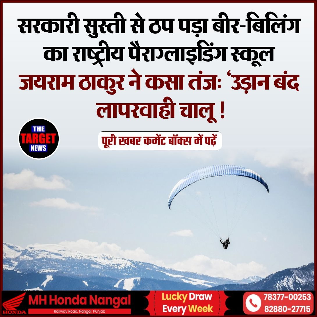 (National Paragliding School at Bir-Billing Halted Due to Govt Lethargy — Jai Ram Thakur Slams: ‘Flights Grounded, Negligence Ongoing)हिमाचल प्रदेश के प्रतिष्ठित बीर-बिलिंग राष्ट्रीय पैराग्लाइडिंग स्कूल पर सरकार की बेरुख़ी ने एक बार फिर राजनीतिक बहस को हवा दे दी है। नेता प्रतिपक्ष जयराम ठाकुर ने सरकार पर तीखा हमला करते हुए कहा कि यह संस्थान पिछले नौ महीनों से बंद पड़ा है, जो राज्य की खुली लापरवाही और उदासीनता का प्रतीक है।