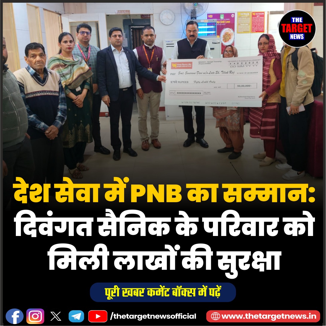 (PNB Hands ₹50 Lakh Insurance Cheque to Late Soldier’s Family)सैनिकों और अर्द्धसैनिक बलों के परिवारों के प्रति अपनी संवेदनशीलता और प्रतिबद्धता को दर्शाते हुए पंजाब नेशनल बैंक नंगल ने दिवंगत (सेवानिवृत्त) सैनिक श्री तिलक राज के परिवार को ₹50 लाख का दुर्घटना बीमा चेक प्रदान किया। यह राशि बैंक की पीएनबी रक्षक योजना के अंतर्गत दी गई, जिसका उद्देश्य पेंशनभोगी सैन्य कर्मियों और उनके आश्रितों को वित्तीय सुरक्षा प्रदान करना है।