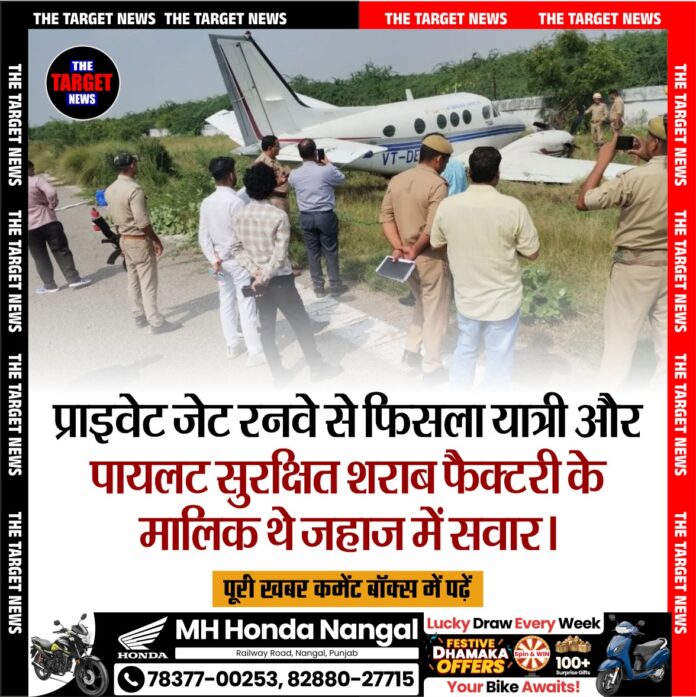 (Private jet skids off runway; liquor factory owner among passengers, all safe)मोहम्मदाबाद एयरस्ट्रिप पर एक निजी जेट रनवे से फिसलकर झाड़ियों में जा घुसा है। हालांकि, सभी यात्री और दोनों पायलट पूरी तरह सुरक्षित हैं। घटना उत्तर प्रदेश की है।