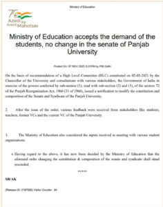 (Centre withdraws decision to dissolve PU Senate, Syndicate to continue)केंद्र सरकार ने पंजाब विश्वविद्यालय (पीयू) से जुड़ा अहम फैसला लेते हुए नया नोटिफिकेशन जारी किया है। इस नोटिफिकेशन में स्पष्ट किया गया है कि सीनेट को भंग करने का पहले लिया गया निर्णय अब वापस ले लिया गया है। इसके साथ ही पुरानी सीनेट और सिंडिकेट अपने-अपने पदों पर बनी रहेंगी।