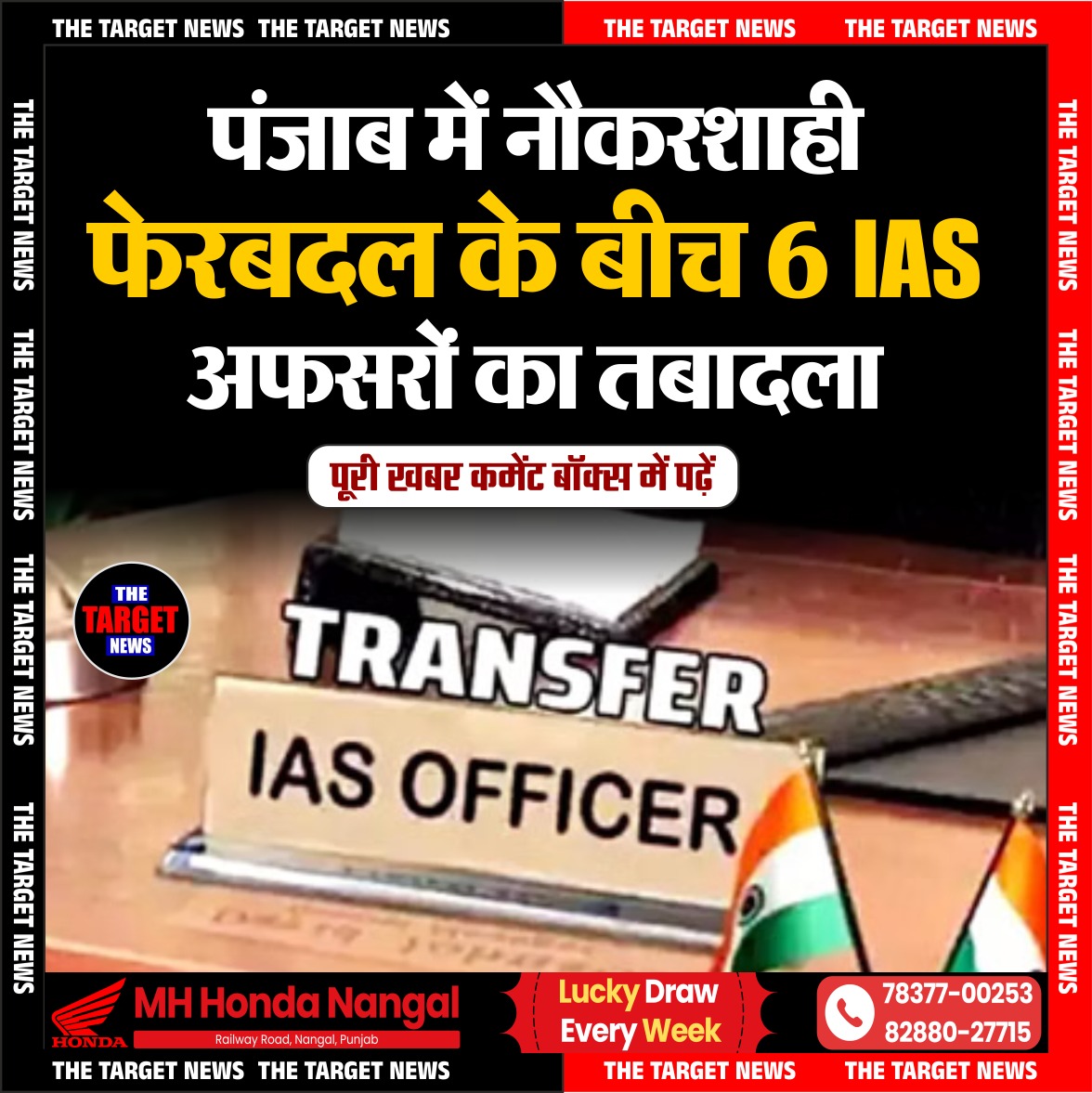(6 IAS officers transferred amid Punjab bureaucratic reshuffle)पंजाब सरकार ने बुधवार को प्रशासनिक फेरबदल करते हुए छह आईएएस अधिकारियों के तबादले के आदेश जारी किए।