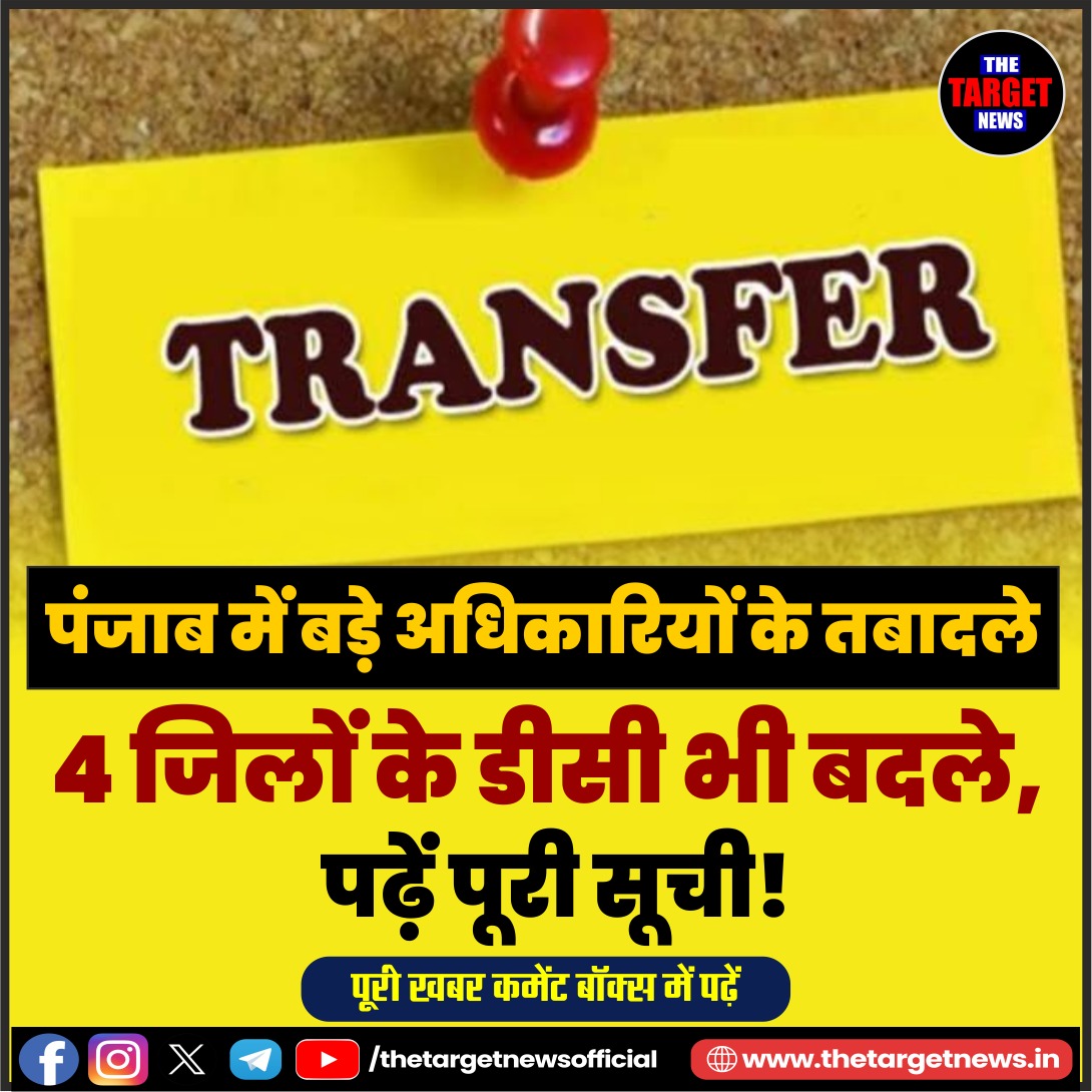 सरकारी आदेशों के अनुसार पटियाला, रूपनगर, शहीद भगत सिंह नगर और बरनाला जिलों के डिप्टी कमिश्नरों को नई जिम्मेदारियां सौंपी गई हैं। इन तबादलों को राज्य में प्रशासनिक मजबूती, पारदर्शिता और कार्यकुशलता बढ़ाने की दिशा में एक अहम कदम माना जा रहा है। सूत्रों के अनुसार सरकार का उद्देश्य जमीनी स्तर पर योजनाओं के बेहतर क्रियान्वयन और जनता से जुड़े मामलों में तेजी लाना है।