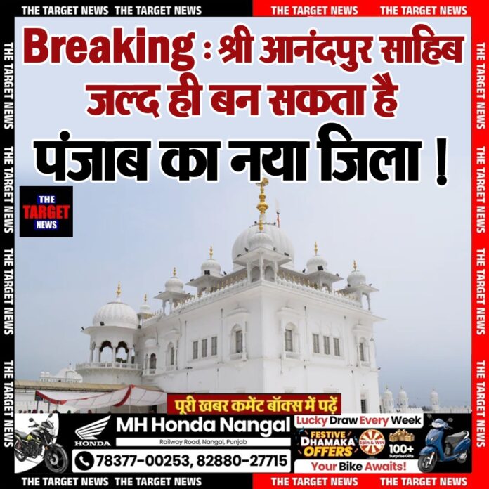 (Punjab May Make Anandpur Sahib 24th District on Guru Tegh Bahadur’s 350th Martyrdom Day)श्री गुरु तेग बहादुर साहिब के 350वें बलिदान दिवस के अवसर पर पंजाब सरकार श्री आनंदपुर साहिब को नया जिला बनाने पर विचार कर रही है। इस मामले में एक सर्वे पर सहमति बनाई गई है। यदि यह योजना लागू होती है, तो यह पंजाब का 24वां जिला होगा। श्री आनंदपुर साहिब को वर्तमान में रूपनगर जिले में तीन विधानसभा हलके—रोपड़, श्री आनंदपुर साहिब और श्री चमकौर साहिब—में बांटा गया है। पड़ोसी जिले होशियारपुर की छह सीटों में से कुछ को भी नए जिले में शामिल करने पर विचार चल रहा है।
