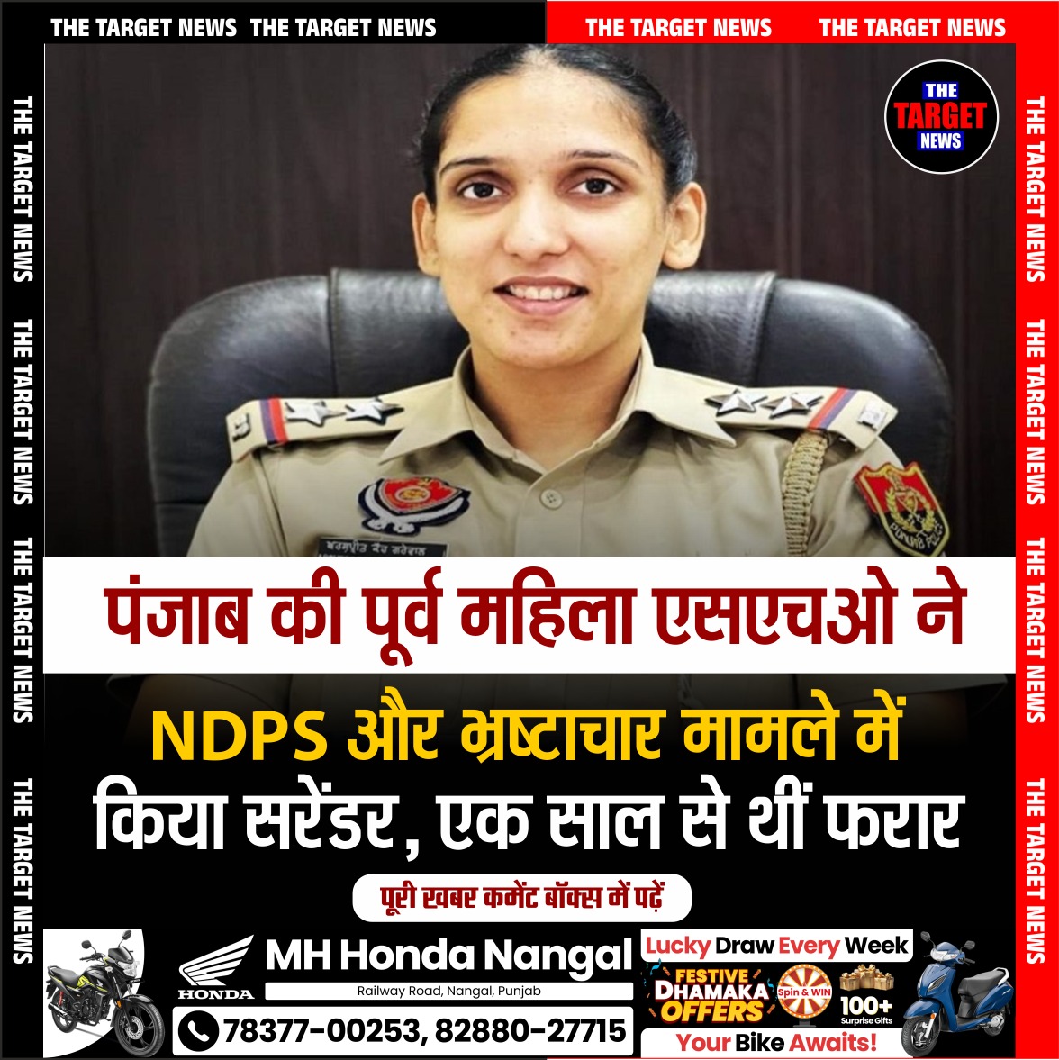 (Punjab Ex-Female SHO Surrenders in NDPS, Corruption Case After Year on the Run)पंजाब के मोगा की पूर्व थाना प्रभारी (एसएचओ) अर्शप्रीत कौर ग्रेवाल ने आखिरकार एक साल की फरारी के बाद स्थानीय अदालत में आत्मसमर्पण कर दिया है। वे अतिरिक्त सत्र न्यायाधीश रवींद्र कौर की अदालत में पेश हुईं, जहां से उन्हें 20 अक्टूबर तक न्यायिक हिरासत में भेज दिया गया।