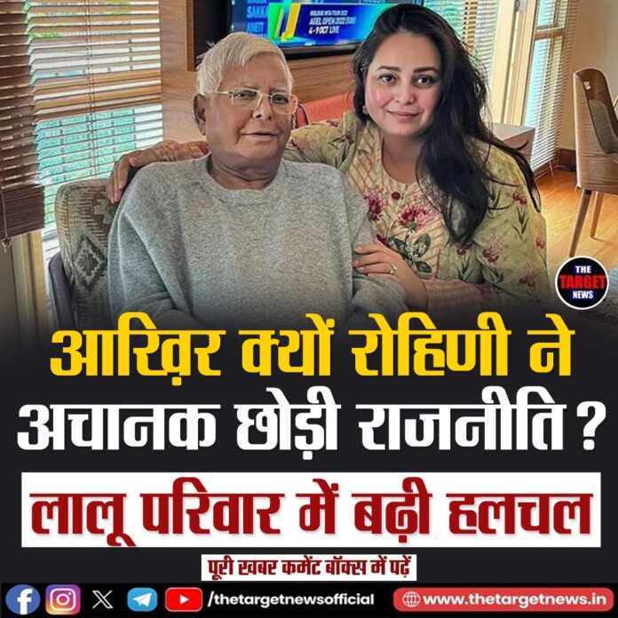 (Rohini Acharya Quits Politics, Distances Herself from Lalu Family)बिहार की राजनीति में उस समय जोरदार हलचल मच गई जब लालू प्रसाद यादव की बेटी और तेजस्वी यादव की बहन, रोहिणी आचार्य ने अचानक राजनीति से संन्यास लेने और अपने परिवार से दूरी बनाने का चौंकाने वाला फैसला घोषित कर दिया। यह कदम ठीक उस समय आया है जब हाल ही में हुए बिहार विधानसभा चुनावों में राष्ट्रीय जनता दल (RJD)-कांग्रेस के नेतृत्व वाले महागठबंधन (MGB) को भाजपा और जेडीयू के हाथों करारी हार झेलनी पड़ी। चुनावी हार के बाद विपक्ष में छाई मायूसी के बीच रोहिणी का यह ऐलान पार्टी और यादव परिवार दोनों के लिए बड़ा राजनीतिक झटका साबित हो रहा है।