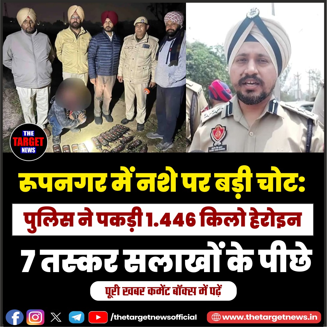 (Ropar Police Seize 1.446 Kg Heroin, Seven Arrested in Anti-Drug Drive)पंजाब के रूपनगर जिले में पुलिस ने ‘जंग नशा विरुद्ध’ अभियान के तहत बड़ी कामयाबी हासिल की है। जिलेभर में चलाए जा रहे विशेष चेकिंग और नाकाबंदी अभियान के दौरान पुलिस ने 1 किलो 446 ग्राम हेरोइन और 19 बोतल अवैध देसी शराब बरामद की है। इस कार्रवाई में कुल 7 आरोपियों को गिरफ्तार किया गया है, जिससे क्षेत्र में सक्रिय नशा तस्करों पर बड़ा प्रहार माना जा रहा है।