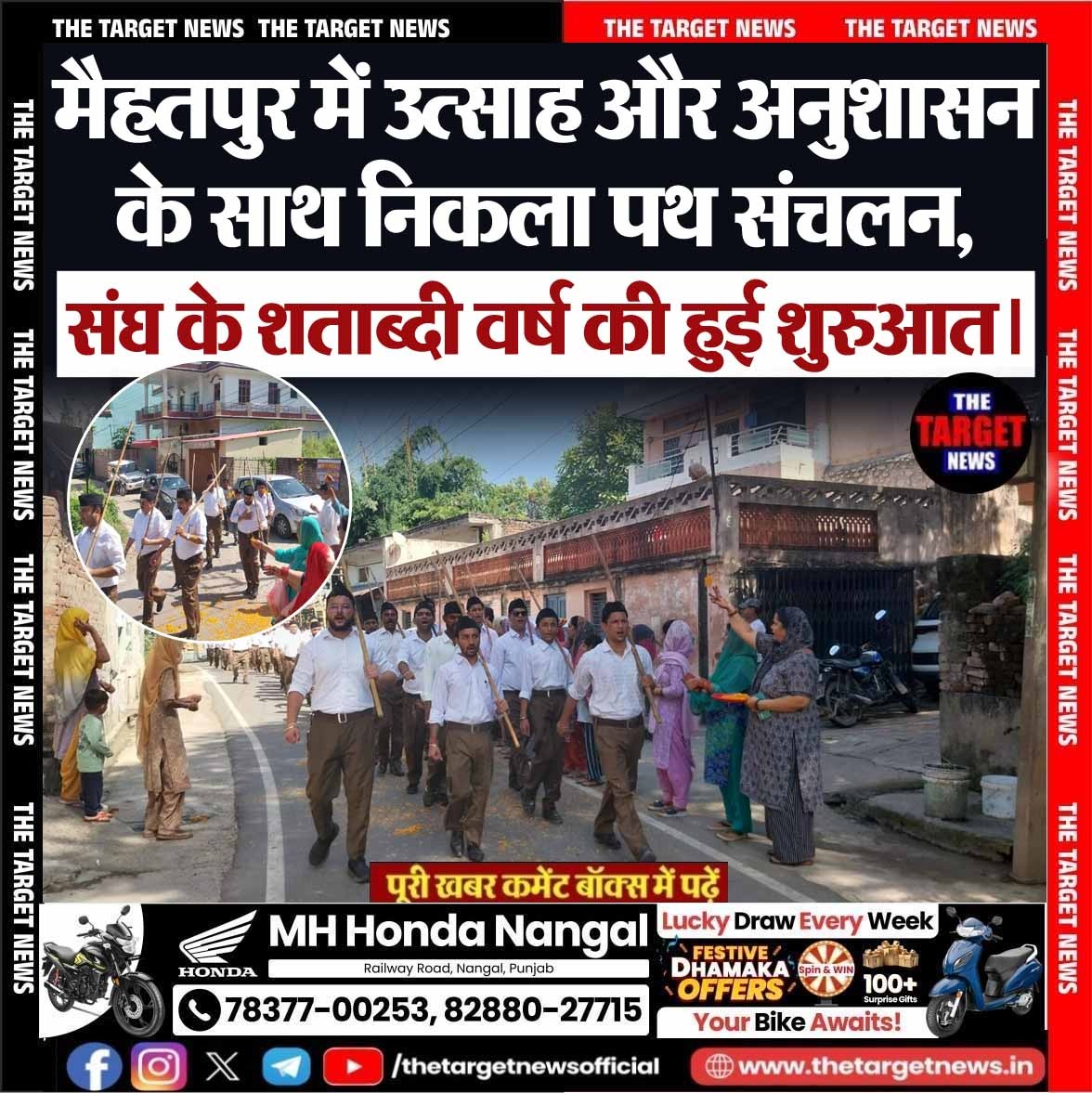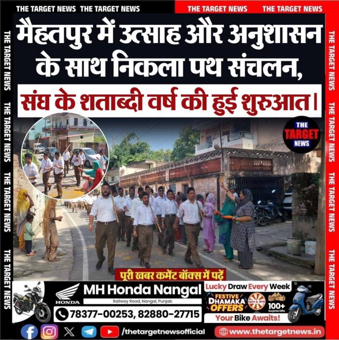 (Disciplined Path Sanchalan Marks RSS Centenary Celebration in Mehatpur) राष्ट्रीय स्वयंसेवक संघ की स्थापना के 100 वर्ष पूरे होने के उपलक्ष्य में रविवार को मैहतपुर नगर में विशाल पथ संचलन का आयोजन किया गया। महाराणा प्रताप पार्क से आरंभ हुआ यह संचलन ट्रक यूनियन व मुख्य बाजार से होते हुए एमसी पार्क में संपन्न हुआ। अनुशासन और उत्साह से ओतप्रोत सैकड़ों स्वयंसेवकों ने पूर्ण गणवेश में कदमताल करते हुए भाग लिया। लोगों ने पुष्प वर्षा कर उनका गर्मजोशी से स्वागत किया।