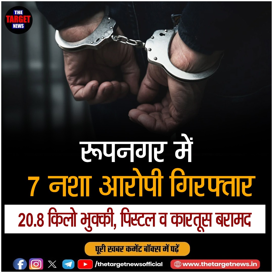(7 Held in Rupnagar: 20.8 Kg Bhukki, Pistol and Cartridges Seized)रूपनगर पुलिस ने नशा तस्करी के खिलाफ चलाए जा रहे विशेष अभियान “युद्ध नशा विरुद्ध” के तहत बड़ी सफलता हासिल की है। 28 नवंबर 2025 को SSP रूपनगर गुलनीत सिंह खुराना द्वारा जारी प्रेस नोट में बताया गया कि जिलेभर में की गई नाकाबंदी और छापेमारी के दौरान कुल 7 नशा आरोपियों को गिरफ्तार किया गया है। इनके कब्जे से 20.8 किलोग्राम भुक्की, 32 बोर की अवैध पिस्तौल और तीन जिंदा कारतूस बरामद किए गए।