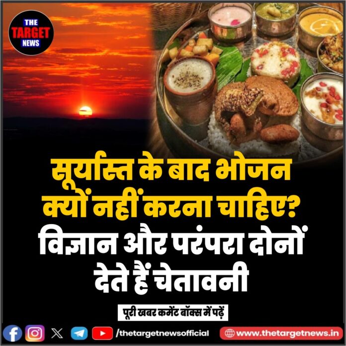 (Why You Should Avoid Eating After Sunset)सूर्यास्त के बाद भोजन करना स्वास्थ्य के लिए कितना सही है, इसे लेकर लंबे समय से वैज्ञानिकों और पारंपरिक ज्ञान में चर्चा होती रही है। विशेषज्ञ मानते हैं कि हेल्दी डाइट के साथ-साथ भोजन का सही समय भी उतना ही ज़रूरी है। रिपोर्ट्स के मुताबिक, जैसे ही शाम ढलती है, शरीर का मेटाबोलिज़म प्राकृतिक रूप से धीमा पड़ने लगता है। ऐसे में देर रात खाया गया भोजन ठीक तरह से पच नहीं पाता और पाचन तंत्र पर अतिरिक्त बोझ डालता है।