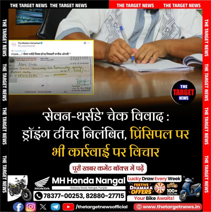 (Seven Thursday’ cheque row: Drawing teacher suspended, action against Principal under consideration)सरमौर ज़िले के रोनहाट स्थित सरकारी वरिष्ठ माध्यमिक विद्यालय से जारी “Saven Thursday Six Harendra Sixty” वाले वायरल चेक मामले ने अब आधिकारिक कार्रवाई का रूप ले लिया है। हिमाचल प्रदेश के शिक्षा निदेशालय ने ड्रॉइंग टीचर अत्तर सिंह को निलंबित कर दिया है। उन्होंने लिखित रूप में स्वीकार किया कि वही इस चेक को भरने के जिम्मेदार थे, जिससे राज्य की शिक्षा प्रणाली को राष्ट्रीय स्तर पर शर्मिंदगी का सामना करना पड़ा।
