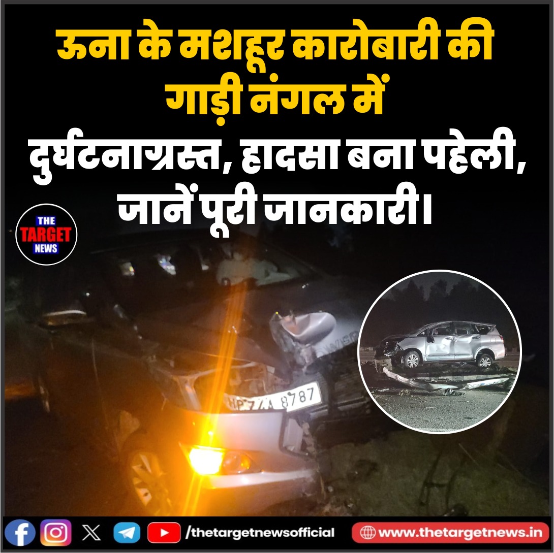 (Una Businessman’s Car Crashes in Nangal, Accident Remains a Mystery)हिमाचल प्रदेश के ऊना जिले के मेहतपुर के एक मशहूर कारोबारी की कार नंगल में हादसे का शिकार हो गई। जानकारी के अनुसार मेहतपुर निवासी प्रसिद्ध कारोबारी, जो सोनी ज्वैलर्स और सोनी एरिना होटल से जुड़े बताए जा रहे हैं, की इनोवा कार मेहतपुर से नंगल की ओर जा रही थी। इसी दौरान शिवालिक एवेन्यू के समीप फ्लाईओवर पुल पर उनकी गाड़ी अचानक अनियंत्रित होकर दुर्घटनाग्रस्त हो गई।
