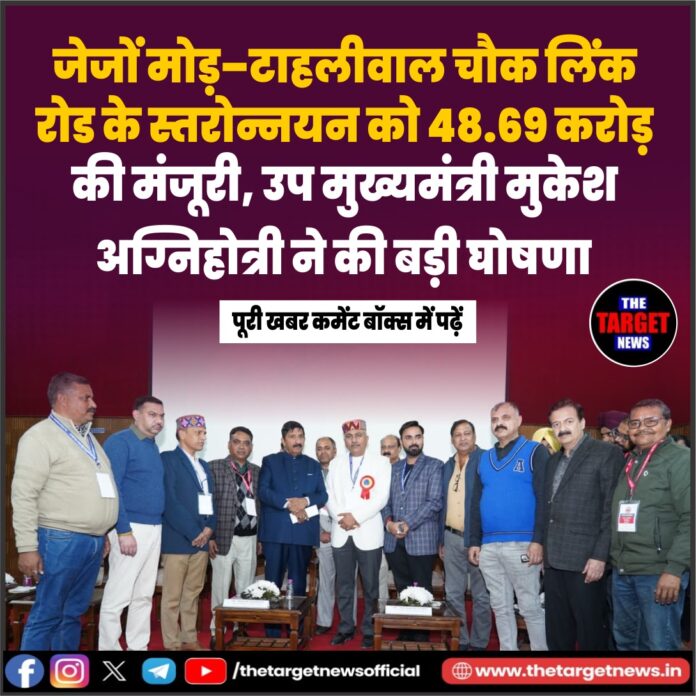 (₹48.69 Crore Approved for Jejon–Tahliwal Link Road Upgrade in Una)उप मुख्यमंत्री मुकेश अग्निहोत्री के निरंतर प्रयासों के परिणामस्वरूप ऊना जिले को सड़क अधोसंरचना विकास में बड़ी सौगात मिली है। केंद्र सरकार ने जेजों मोड़ से टाहलीवाल चौक वाया भाई का मोड़ लिंक रोड के स्तरोन्नयन के लिए 48.69 करोड़ रुपये स्वीकृत किए हैं। यह स्वीकृति केंद्रीय सड़क एवं अवसंरचना निधि के अंतर्गत प्रदान की गई है।
