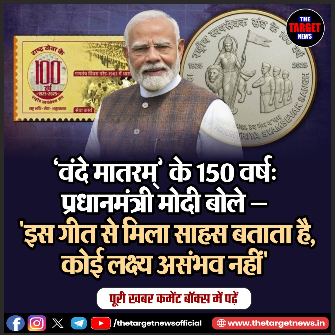 (150 Years of ‘Vande Mataram’: PM Modi Says — “No Goal Is Impossible with the Courage This Song Inspires)भारत के राष्ट्रगीत ‘वंदे मातरम्’ के 150 वर्ष पूरे होने पर शुक्रवार को प्रधानमंत्री नरेंद्र मोदी ने वर्षभर चलने वाले राष्ट्रीय समारोह का भव्य शुभारंभ किया। इस अवसर पर उन्होंने नई दिल्ली के इंदिरा गांधी इंडोर स्टेडियम में एक स्मारक डाक टिकट और स्मारक सिक्का भी जारी किया।