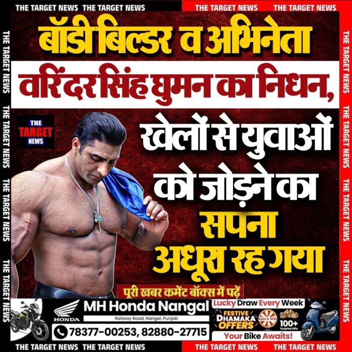 (Bodybuilder and Actor Varinder Singh Ghuman Passes Away, Dream to Inspire Youth Through Sports Remains Unfulfilled)पंजाब के प्रसिद्ध बॉडी बिल्डर और बॉलीवुड अभिनेता वरिंदर सिंह घुमन का गुरुवार को निधन हो गया। बताया जा रहा है कि बुधवार को उन्हें हार्ट अटैक आया था, जिसके बाद उन्हें अमृतसर के एक निजी अस्पताल में भर्ती कराया गया, जहां उन्होंने अंतिम सांस ली। मात्र 40 वर्ष की उम्र में घुमन के निधन से खेल जगत और फिल्म इंडस्ट्री में शोक की लहर है।